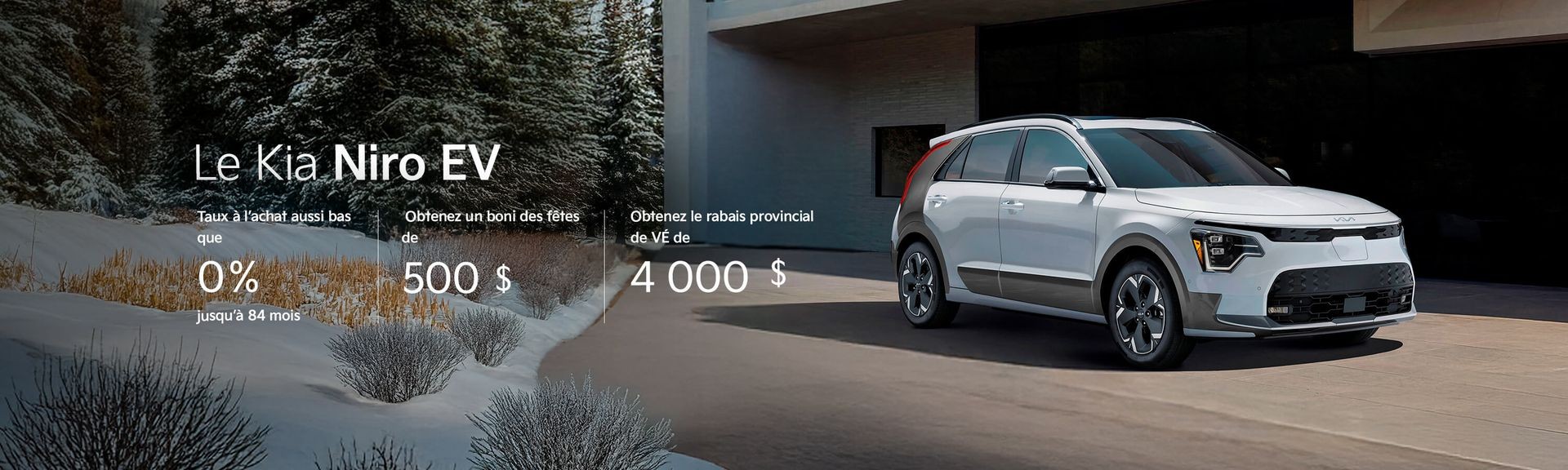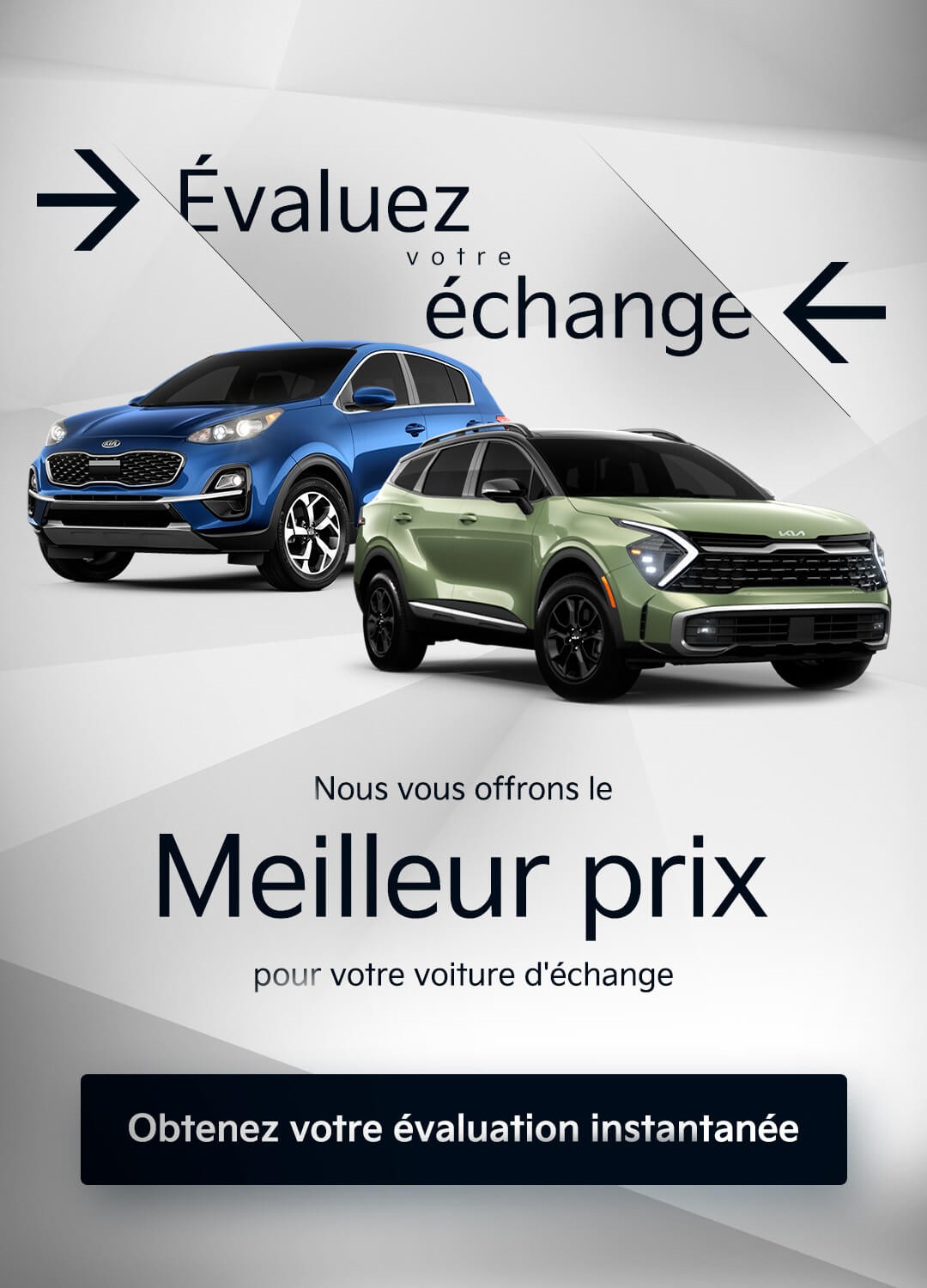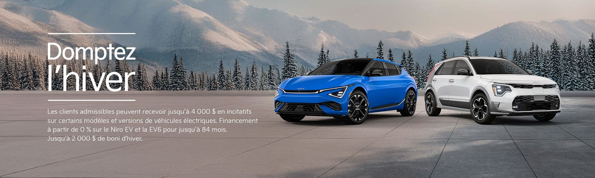 Kia est également une marque tournée vers le futur, qui sera éminemment électrique. C’est pourquoi vous pourrez compter sur une gamme complète de véhicules électriques Kia, mais aussi sur des hybrides performants comme les EV6 2024 ainsi que le Kia Niro, surprenant multisegment sous-compact se déclinant en deux versions (Niro EV et le Niro PHEV). Par ailleurs, si vous recherchez une Kia usagée à vendre au Centre-du-Québec près de Victoriaville, vous trouverez votre bonheur dans notre vaste inventaire de véhicules Kia d’occasion. Équipez votre garage d'une borne de recharge et choisissez dès aujourd'hui un véhicule électrique à vendre dans notre inventaire.