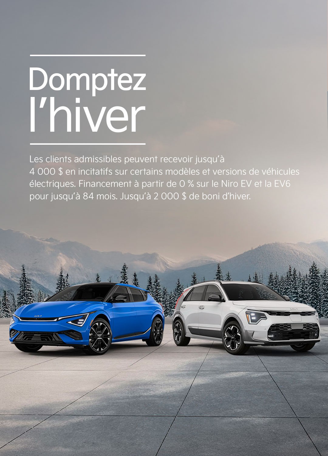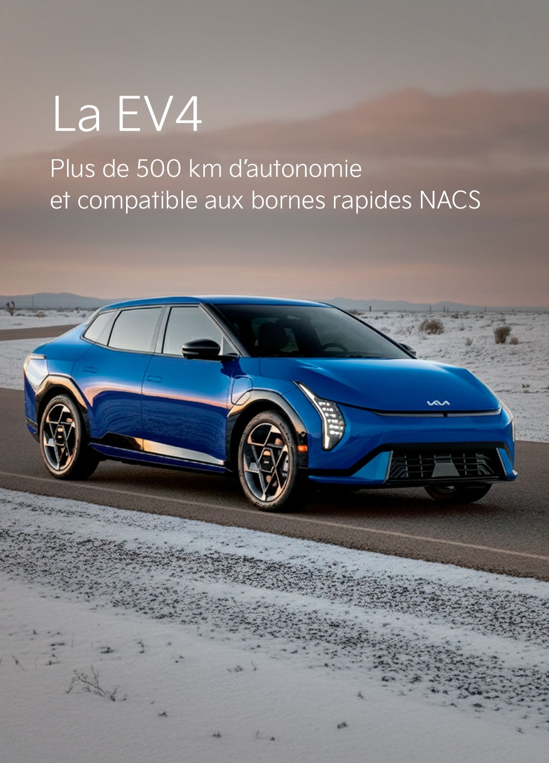 Kia est également une marque tournée vers le futur, qui sera éminemment électrique. C’est pourquoi vous pourrez compter sur une gamme complète de véhicules électriques Kia, mais aussi sur des hybrides performants comme les EV6 2024 ainsi que le Kia Niro, surprenant multisegment sous-compact se déclinant en deux versions (Niro EV et le Niro PHEV). Par ailleurs, si vous recherchez une Kia usagée à vendre au Centre-du-Québec près de Victoriaville, vous trouverez votre bonheur dans notre vaste inventaire de véhicules Kia d’occasion. Équipez votre garage d'une borne de recharge et choisissez dès aujourd'hui un véhicule électrique à vendre dans notre inventaire.