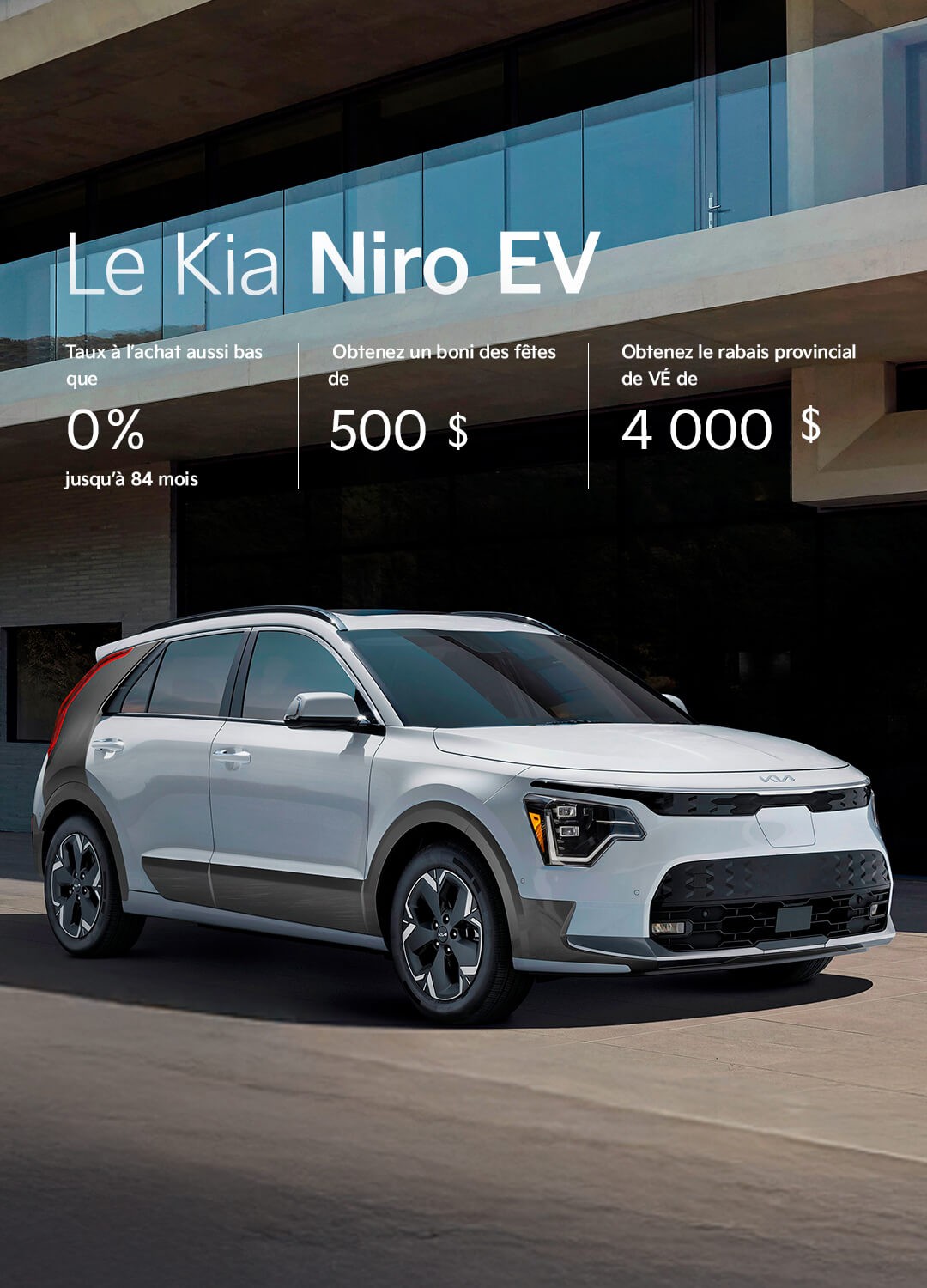Kia est également une marque tournée vers le futur, qui sera éminemment électrique. C’est pourquoi vous pourrez compter sur une gamme complète de véhicules électriques Kia, mais aussi sur des hybrides performants comme les EV6 2024 ainsi que le Kia Niro, surprenant multisegment sous-compact se déclinant en deux versions (Niro EV et le Niro PHEV). Par ailleurs, si vous recherchez une Kia usagée à vendre au Centre-du-Québec près de Victoriaville, vous trouverez votre bonheur dans notre vaste inventaire de véhicules Kia d’occasion. Équipez votre garage d'une borne de recharge et choisissez dès aujourd'hui un véhicule électrique à vendre dans notre inventaire.